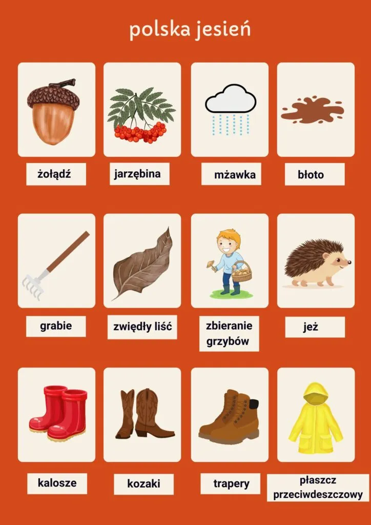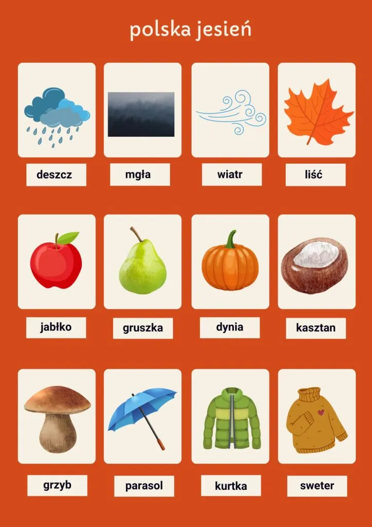 Kolory polskiej jesieni to pomarańczowy, złoty, czerwony, brązowy. Jesienią nosimy kurtki, czapki, szaliki i swetry. Owoce i warzywa, które zbiera się jesienią w Polsce to jabłka, gruszki i dynie. W lasach jest pełno grzybów, żołędzi i czerwonej jarzębiny. Na ulicach leżą kasztany, wieczorem można spotkać jeża.